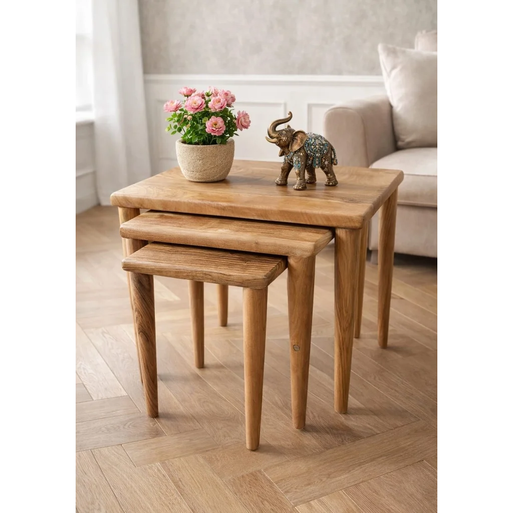 Tamamı masif kestane veya ceviz ağacından üretilen 3’lü zigon sehpa setimiz, yaşam alanlarınıza hem şıklık hem de işlevsellik katar. Her biri ustalıkla şekillendirilmiş bu özel tasarım, doğal ahşabın sıcak dokusunu evinize taşırken uzun ömürlü kullanım sunar.