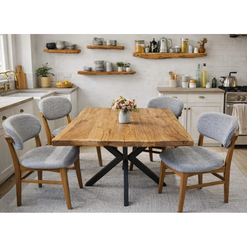 120x80 cm ölçüsündeki %100 ceviz masa, ahtapot demir ayak formuyla mimari bir denge sunar. Net çizgiler, kusursuz oran ve güçlü bir duruş.. Polo ceviz sandalyeler ise formu bozmadan sade bir zarafetle masayı tamamlar.İskelert yapısının sağlamlığı uzun süreli kullanım sunar. Bu takım gösteriş yapmaz, kalitesini hissettirir.