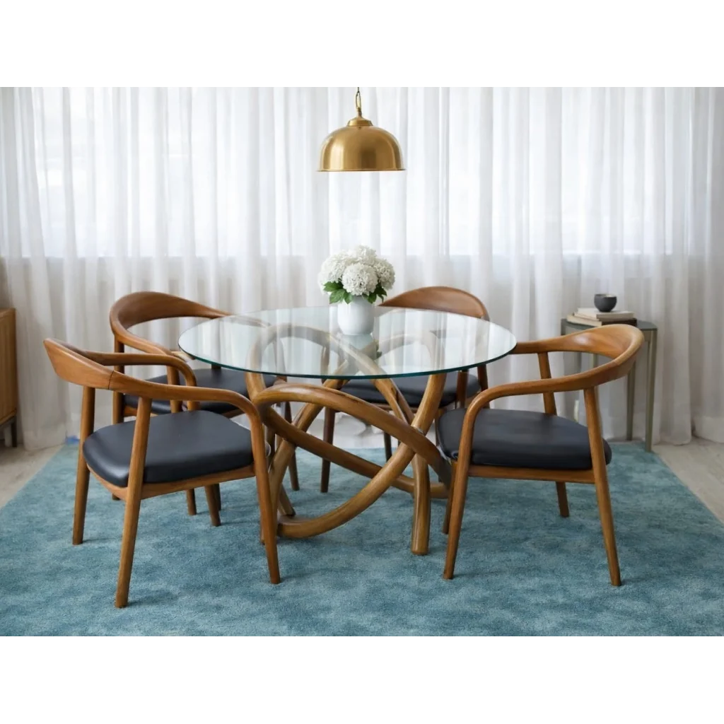 Özel ahşap işçilikle hazırlanan, birbirine geçen sonsuzluk formundaki ayaklar, sadece bir ayakl değil ustanın imzasıdır. üzerinde yer alan cam tabla, tasarımın zerafetini ortaya çıkarırken altındaki ahşap işçiliği görünür kılar. hafiflik hissi verir ama duruşu son derece güçlüdür.  Takımı tamamlayan Oslo diğer adıyla Yılan sandalye kayın ağacından üretilmiştir. Akıcı sırt formu hem estetik hem ergonomik bir oturum sunar.