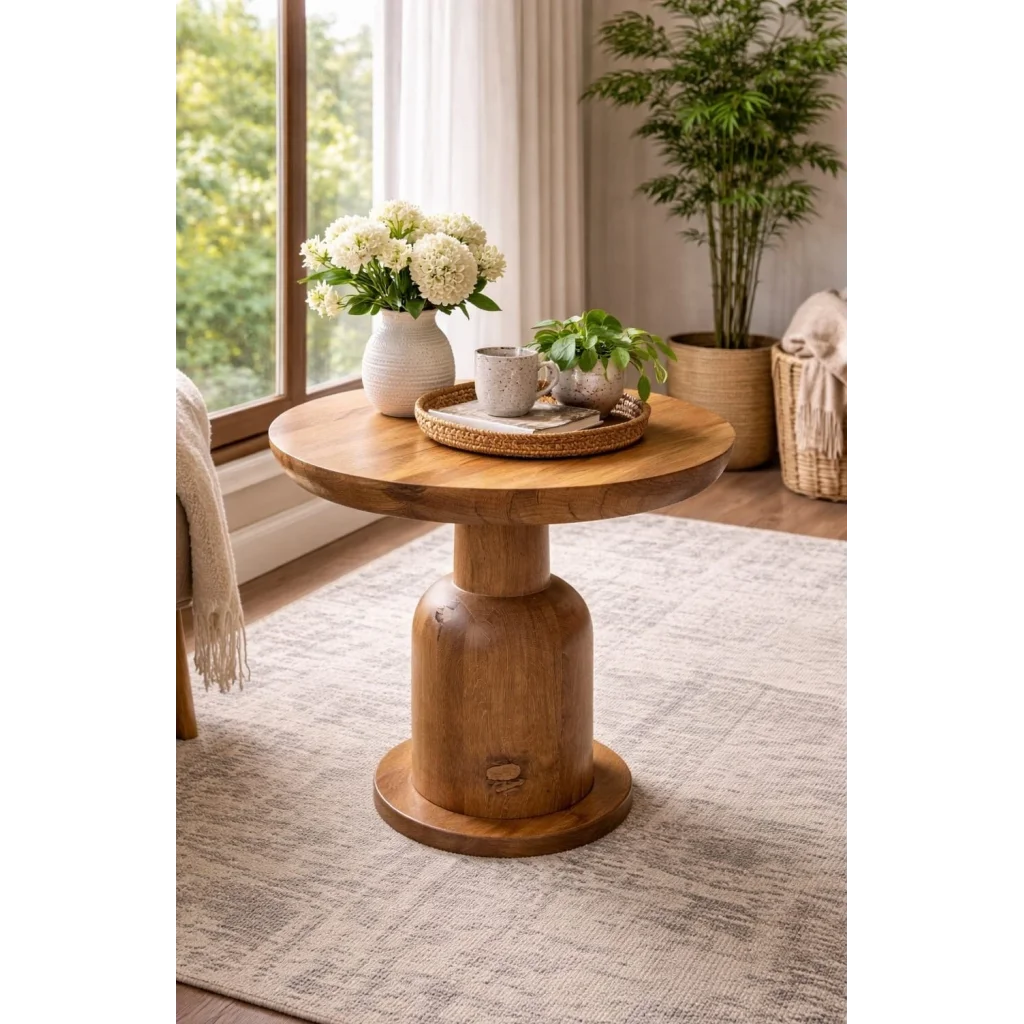 Masif ahşabın sıcak dokusu, yuvarlak formun zarif çizgileriyle buluştu.