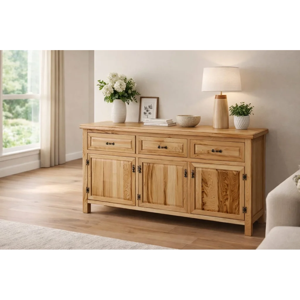 Masif kestane konsol, üst bölümdeki üç açık rafı ve alt bölümdeki üç kapaklı saklama alanıyla hem sergileme hem depolama ihtiyacını dengeli bir formda bir araya getirir. Doğal damar yapısı ve sıcak tonu sayesinde yaşam alanınıza zamansız ve güçlü bir karakter kazandırır.