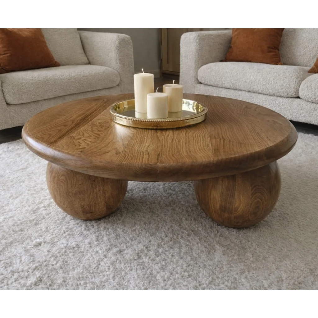 Akışkan ve yumuşak hatlara sahip yuvarlak tablası, mekana zarif bir hareket kazandırır. Oval geçişli kenar detayı sayesinde keskinlikten uzak, dengeli ve estetik form sunar. Alt bölümde yer alan üç adet küre form ahşap ayak, tasaımın en güçlü imzasıdır. Top şeklindeki bu özel ayak yapısı hem dikkat çekici hem de dengeli bir duruş sağlar. Modern sanat objesi veren bu sehpa, bulundupu alanın merkezinde kendini fark ettirir.