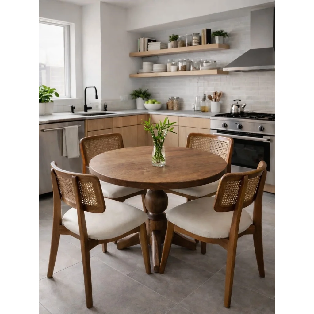 Tamamı masif  cevizden üretilmiş bu özel takım, doğallığın en asil halini yaşam alanlarınıza taşır. Yuvarlak formu ve güçlü baba ayak tasarımı ile masa; dengeli tok ve zamansız bir duruş sergiler. Cevizin doğal damar geçişleri her parçada kendine özgü bir karakter oluşturur. Takımı tamamlayan zeon hazeranlı ceviz sandalyeler el işçiliği hasır sırt detayıyla zarafeti öne çıkarırken ceviz gövdesiyle masayla kusursuz bir bütünlük sağlar. Hafif ama güçlü zarif ama sağlam.